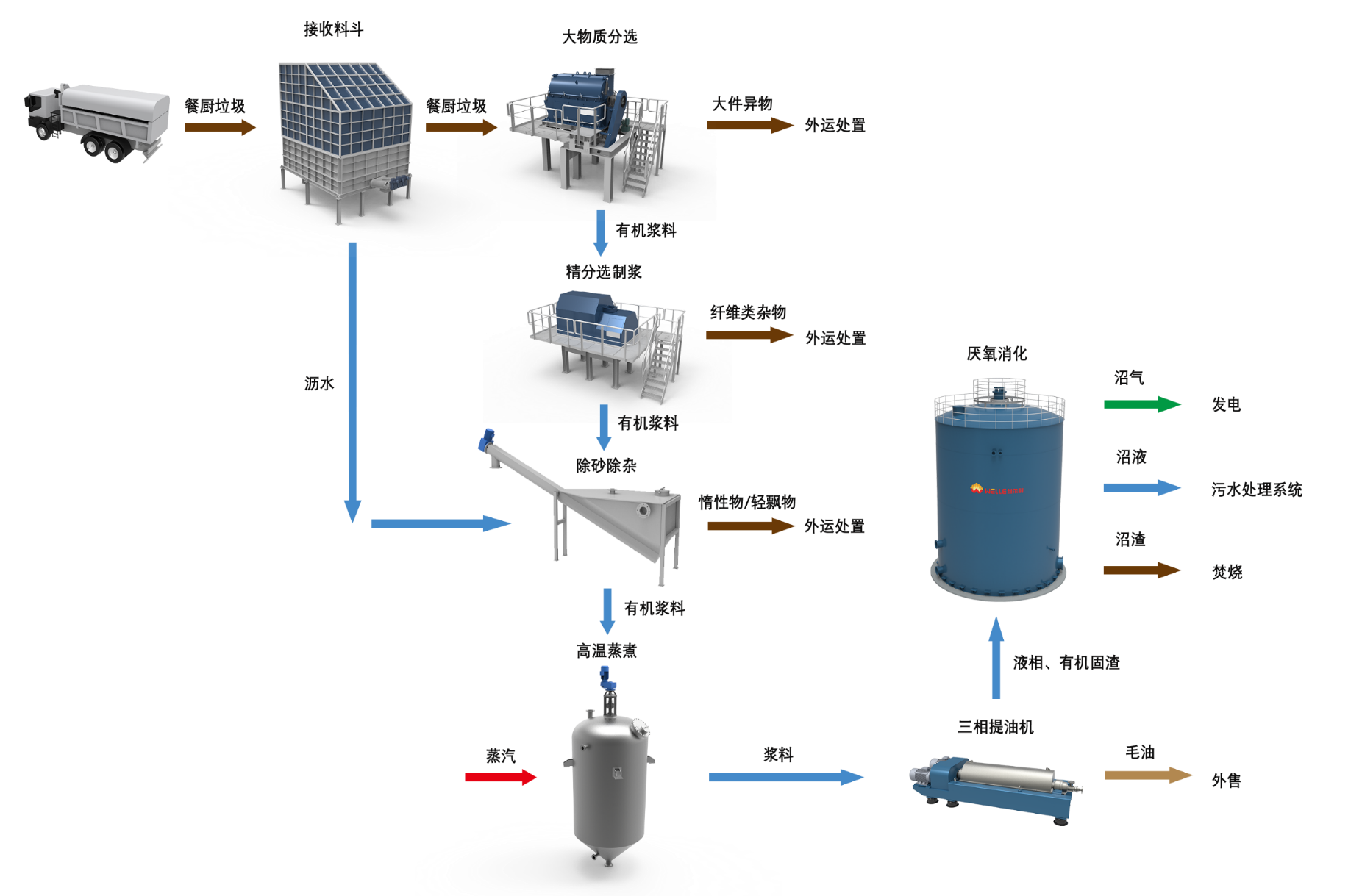 结合一期项目的运营经验,充分考虑到餐厨垃圾的特点和处理难点,二期项目采用“机械预处理+厌氧发酵+沼气发电+污水处理+除臭处理”终端处置工艺,该工艺在减少处置过程中固渣、废水、臭气等污染物的同时,充分有效地分离餐厨垃圾中的有机质并对其进行资源化利用,实现了餐厨垃圾中油脂的最大化资源回收。