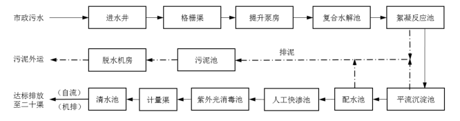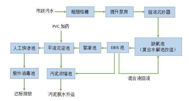 针对以上改造问题,汇恒环保设计团队在充分考虑该水厂实际运行情况,以及工艺先进可靠、经济成本合理、充分利用现有设施条件等要素的基础上,通过加装机械格栅、增设旋流沉砂器、生化增设EBIS(改良A2O)池、深度处理采用“絮凝池+平流沉淀池+人工快渗池”、加装紫外消毒设施等解决方法,大大提高系统脱氮除磷性能,并实现系统扩容需求,出水水质稳定达到一级A标准。
